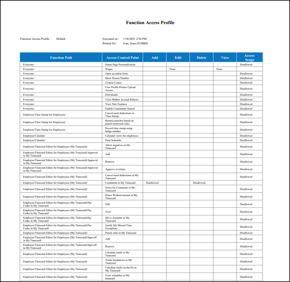 The Function Access Profile report details the access rights configured in a Function Access Profile.